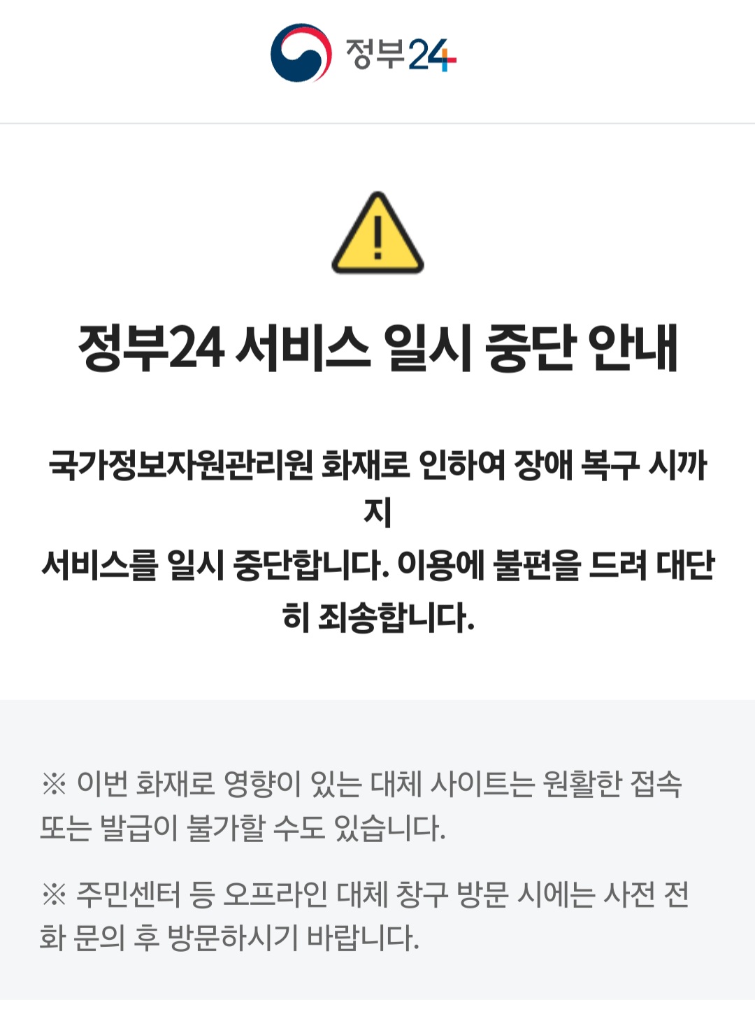 - 정부24 중단 사유 : 국가정보자원관리원 화재